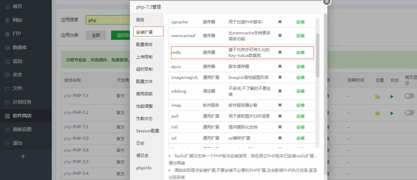 3,进入你所使用的php版本设置,安装扩展,安装redis缓存器