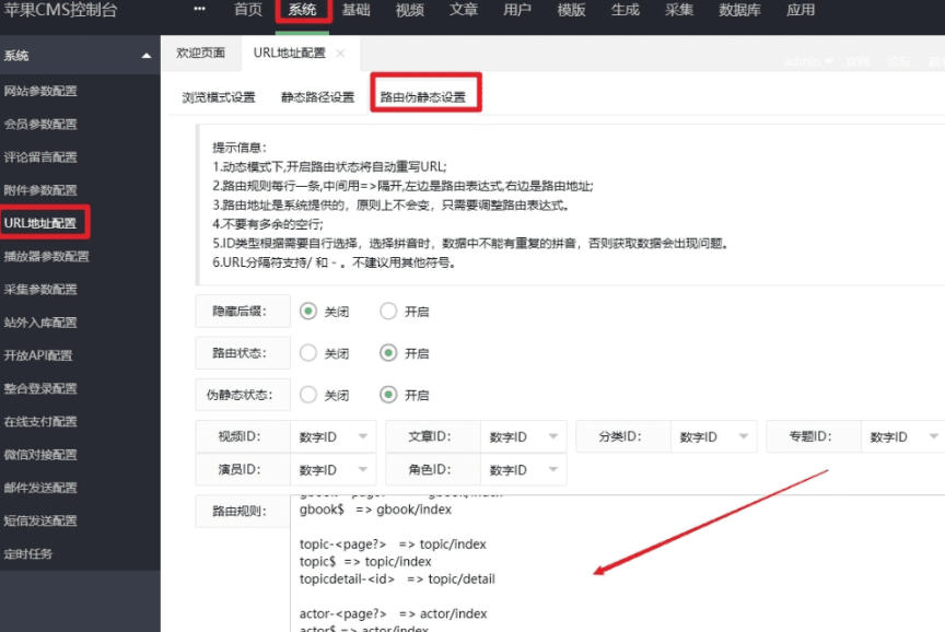 2,规则上传完后进行下一步操作在苹果cms后台,系统—>URL地址设置—>路由伪静态设置中开启对应功能按钮即可大功告成。