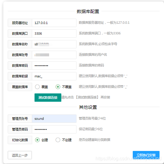 下一步就是配置数据库信息了,把相应的信息填写完全后点击立即执行就安装完成了,系统会直接跳到登录界面(注意:数据库名称帐号密码,在虚拟主机的控制面板里都能找得到)