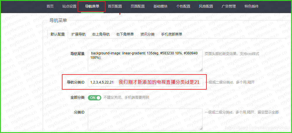 4,如有需要在首页导航显示我们的“电视直播”分类的话,我们需要来到模板后台填写我们新添加的分类id。注意:是模板后台不是苹果系统后台。