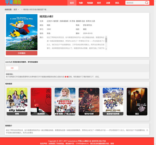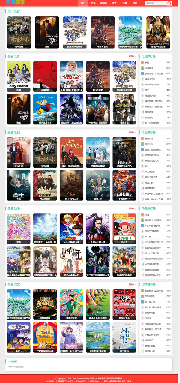 近期找我要极简风格站长不少,看来大家都开始返璞归真了,所以花了一些时间做了这款,极简风格的影视网站模版,该模板最大特点就是,最大化追求版面及代码的极简主义,整个模板文件解压后,只有300kb,和市面上哪些动辄几Mb相比,绝对算得上极简,只是追求极简的人,就不要在乎跑马灯、幻灯片什么了,只保留了影视站最经典的布局,既左右栏设计和基础版面。苹果模板大全出品,必属精品,代码测试兼容性强,支持pc、wap自适应访问,推荐模板!