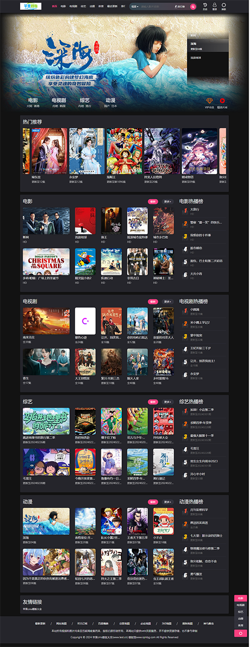 高端大气的黑色影视网站模板,整站UI追求极致美感。新版增加了右侧浮动导航,帮助游客快速查找分类。并且优化了显示数字效果,更加醒目好看。