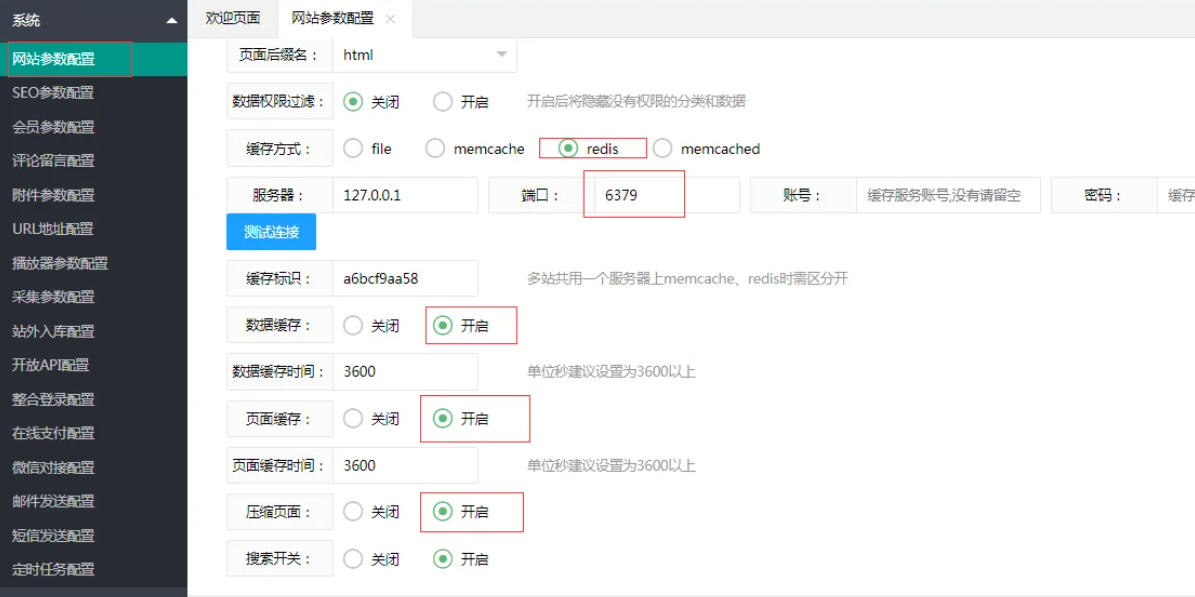 4,进入苹果CMS后台,网站参数设置-性能优化,缓存方式设置为Redis,IP:127.0.0.1端口:6379然后测试连接 连接成功代表能正常使用该缓存,然后开启:数据缓存/页面缓存(如下图)