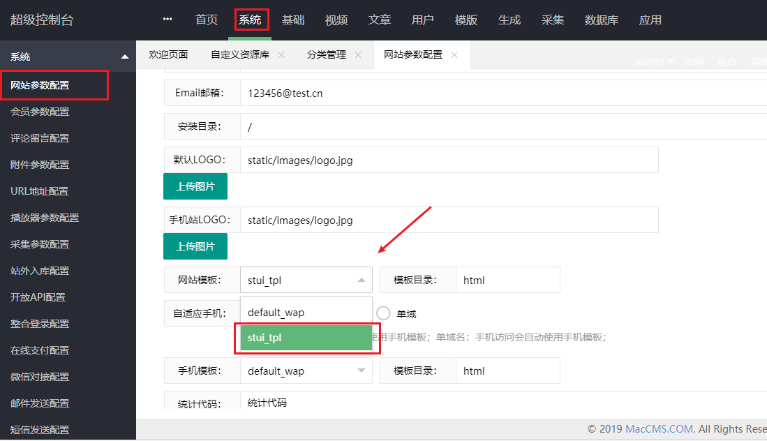 4,来到苹果cms后台切换我们刚才上传的模板。找到【系统】-【网站参数配置】-【网站模板】切换成我们刚才上传的模板。