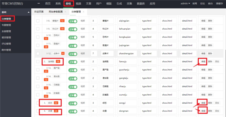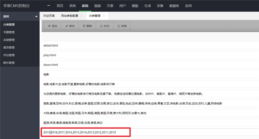 2、苹果CMSV10管理后台>>基础>>>分类管理>>>将【1:电影。2:电视剧。3:综艺。4:动漫】>>> 扩展年代>>> “2019,”逗号隔开(就是在2018,前面加上【2019、2020、2021】保存即可。)