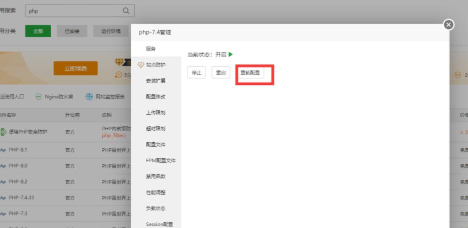 6、设置完毕之后找到php配置,重载配置即可