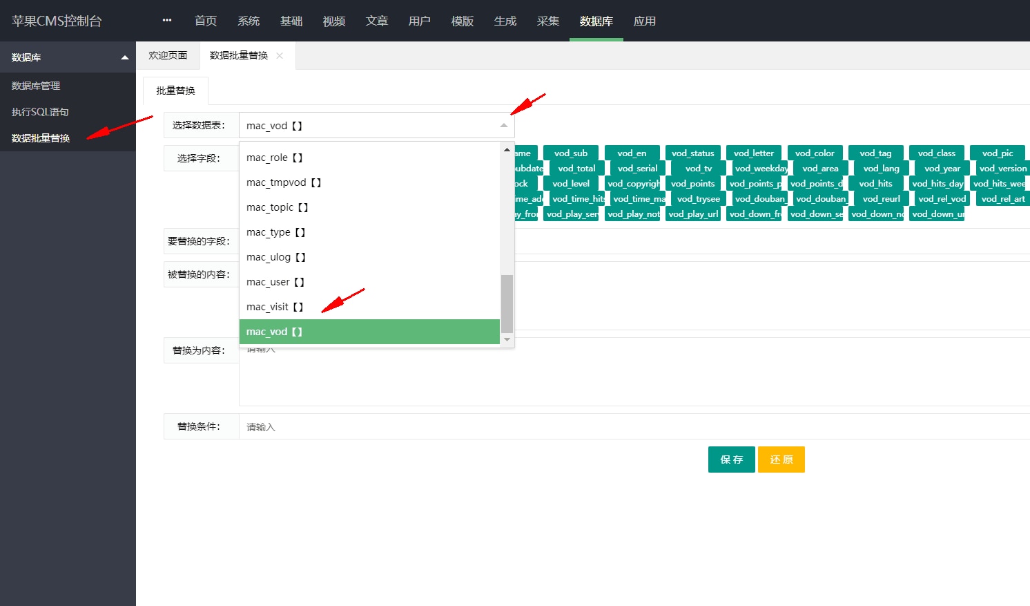 2,数据批量替换-选择数据表-拉到最下选择-mac_vod