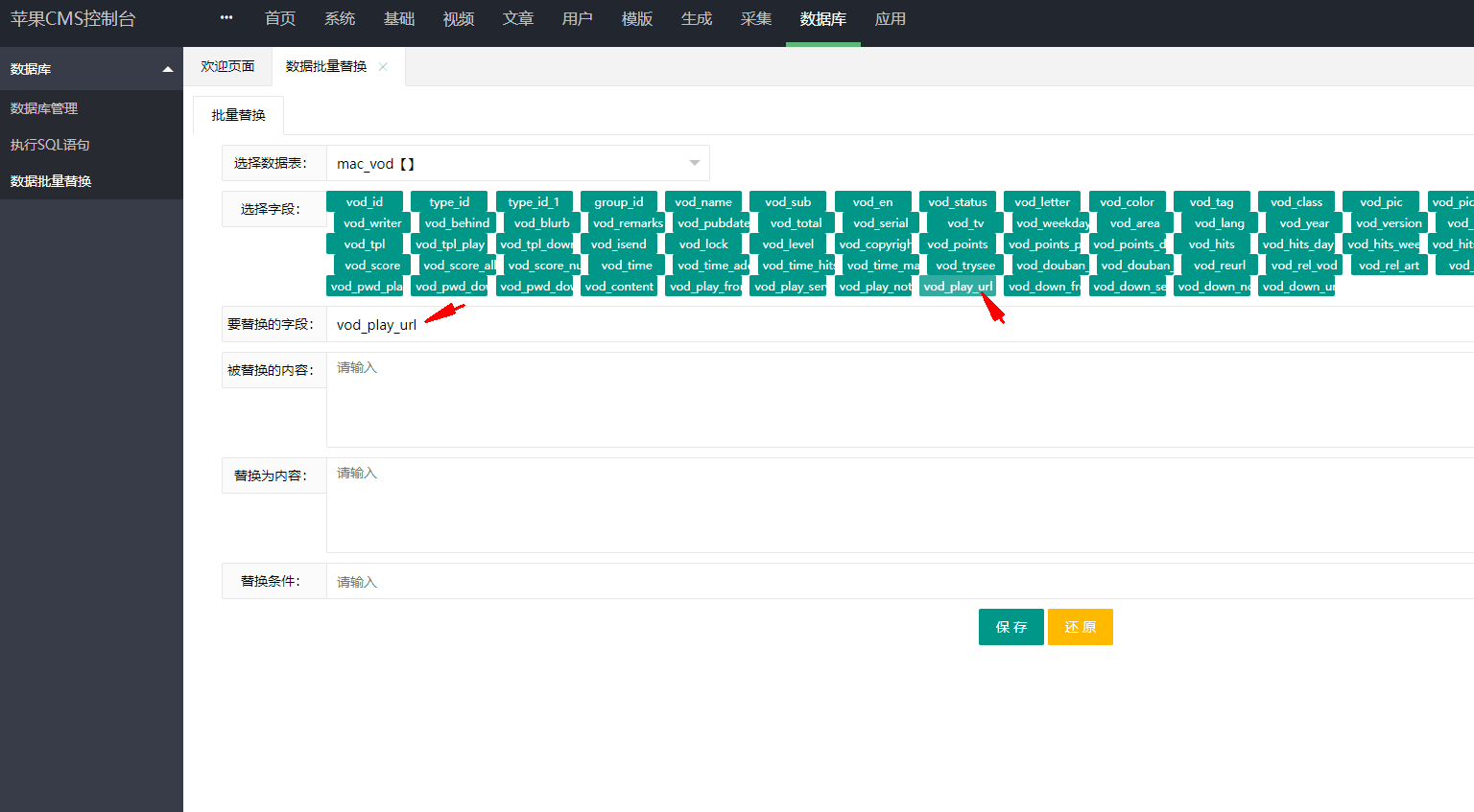 3,选择vod_play_url,选择后 要替换的字段 会显示 vod_play_url