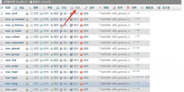 进入phpmyadmin里或其他数据库管理工具,进入苹果CMS V10数据库,点击导入,选择这个sql文件即可。
