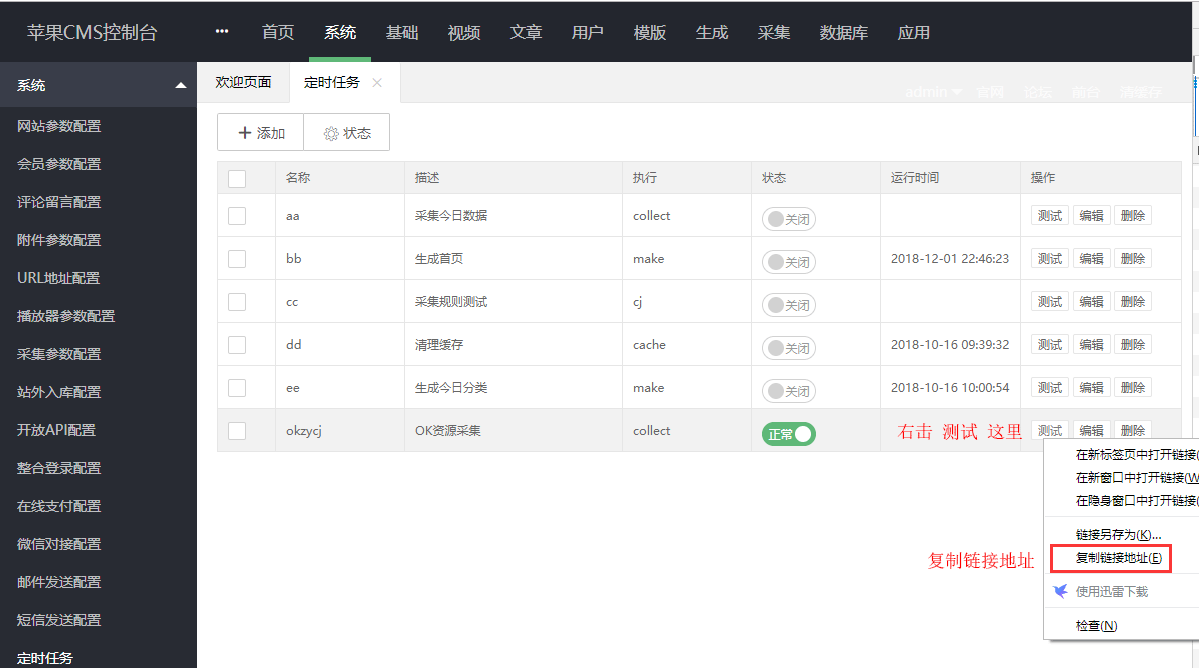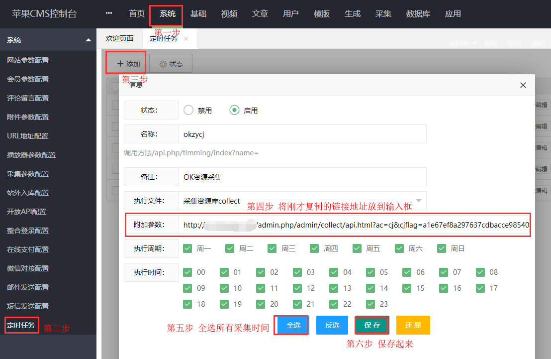 现在要在后面加上( &force=1 ) http://okzyw.com/api.php/timming/index.html?name=okzx&force=1 设置为定时采集,就不会一个小时只采集一次。