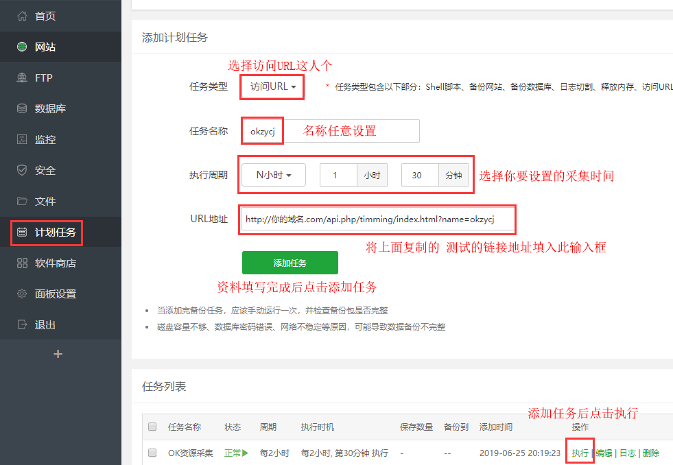 例:原来设置宝塔后台设置定时的是:http://okzyw.com/api.php/timming/index.html?name=okzx