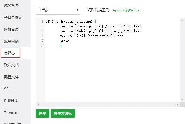 if(!-e$request_filename){ rewrite^/index.php(.*)$/index.php?s=$1 last; rewrite^/admin.php(.*)$/admin.php?s=$1 last; rewrite^/api.php(.*)$/api.php?s=$1 last; rewrite^(.*)$/index.php?s=$1 last; break; } 粘贴到这里