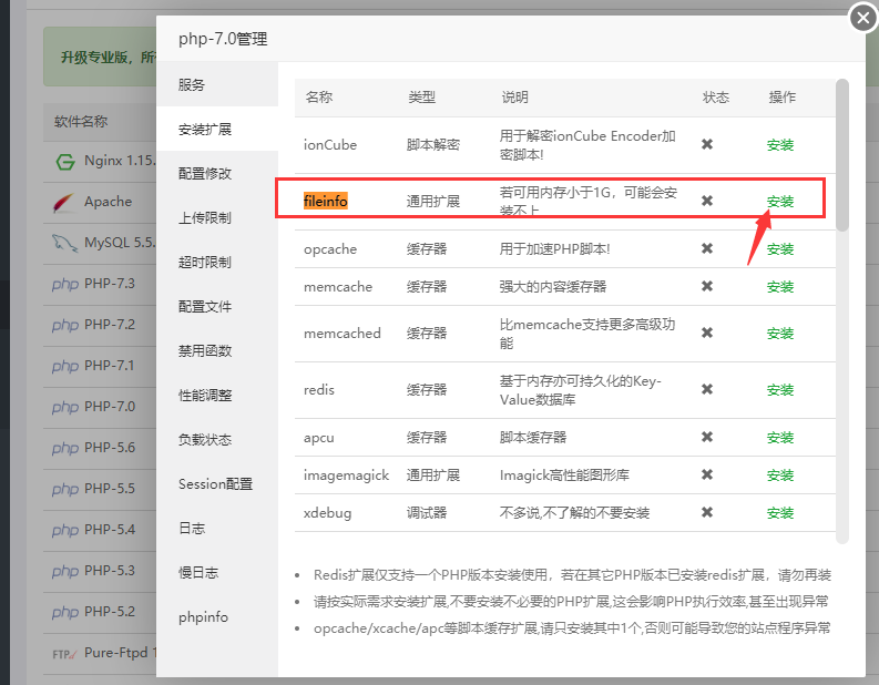出现在这个红的是要去—>软件商店安装PHP 的 安装扩展(安装这个扩展 fileinfo )
