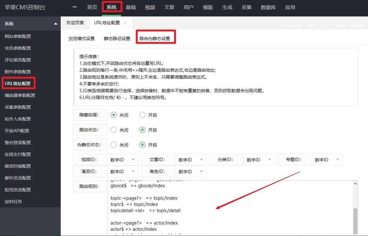 2,规则上传完后进行下一步操作在苹果cms后台,系统—>URL地址设置—>路由伪静态设置中开启对应功能按钮即可大功告成。