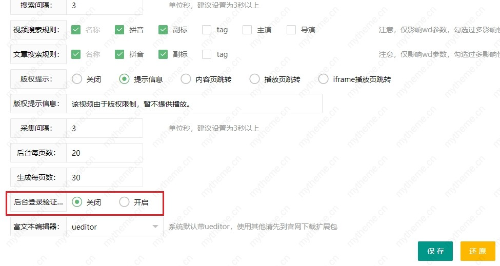 苹果cms怎么关闭验证码登陆后台 作者: 无 • 更新时间:2025-11-18 •阅读 我们在调试网站的时候对于后台的登陆验证感觉有点繁琐,有没有暂时关闭后台登陆验证码的开关呢?答案是肯定的。1.来到苹果cms后台按顺序点击【系统】 【网站参数配置】【 性能优化】下拉到底部就可以看到 2.下图红框的地方就是后台登陆验证的开关 直接关闭即可。 3.修改完后的效果已经取消了验证码登陆,是不是很简单。 本文采摘于网络,不代表本站立场,转载联系作者并注明出处:https://www.73as.com//pgjc/524.html