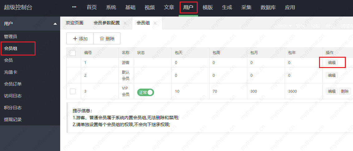第二步:在后台 的 用户>会员组>找到游客用户组>点击编辑按钮