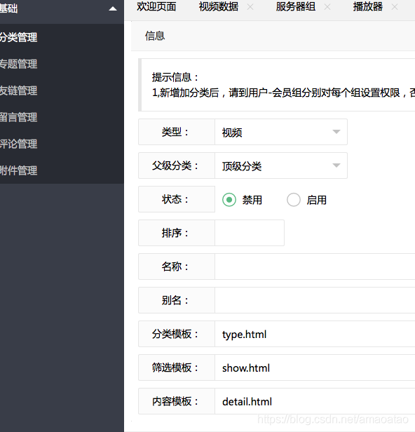 苹果CMS10怎么添加电影分类 作者: 无 • 更新时间:2025-11-18 •阅读 直接来方法,依次点击基础-分类管理-添加,如图所示: 点击添加之后弹出如下界面: 稍微编辑一下就OK了 本文采摘于网络,不代表本站立场,转载联系作者并注明出处:https://www.73as.com//pgjc/607.html
