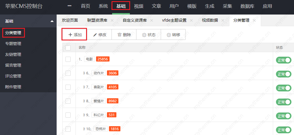 1.首先进入后台 ,按顺序依次点击 基础>>>分类管理>>>添加