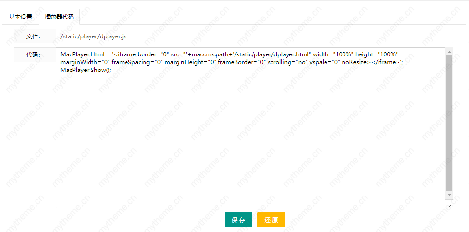 2-4:最后就是添加播放器代码,刚才的设置只是一个空播放器没有内容,我们既然调用dplayer播放器那这里必须填写dplayer播放器的代码,我们直接把dplayer播放器的代码复制出来粘贴到这里就可以了然后记得保存一下。这是一个资源站的播放添加过程,如果你采集了几个资源站的话就按照全步骤重新添加即可,谨记一定要填写正确的播放器编码。