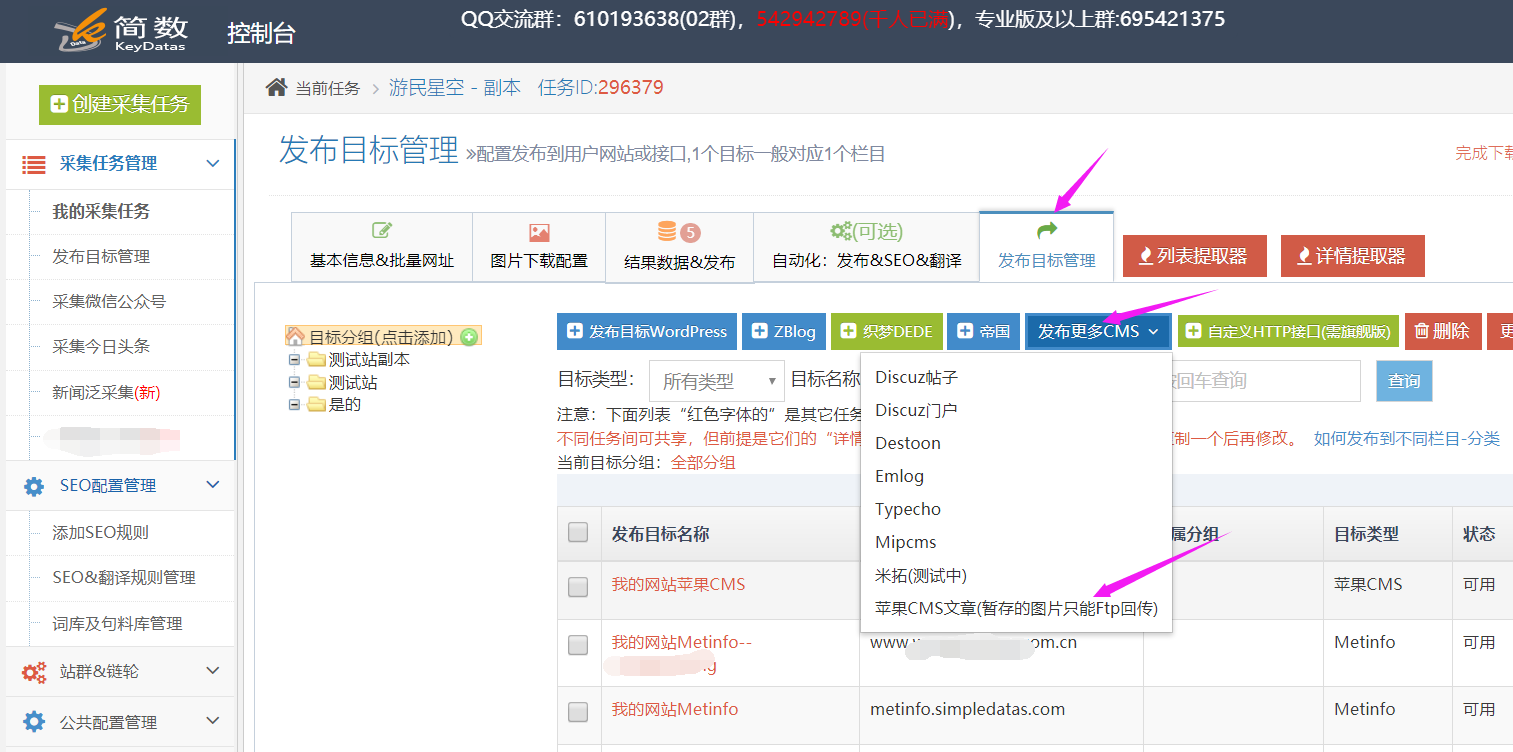 进入简数控制台,从”我的采集任务“列表中打开一个任务,进入采集任务管理页面,找到【发布目标管理】 ==》点击【发布更多CMS】==》点击【苹果CMS文章】,在配置页面填写基本信息和设置发布对应字段,如下图: