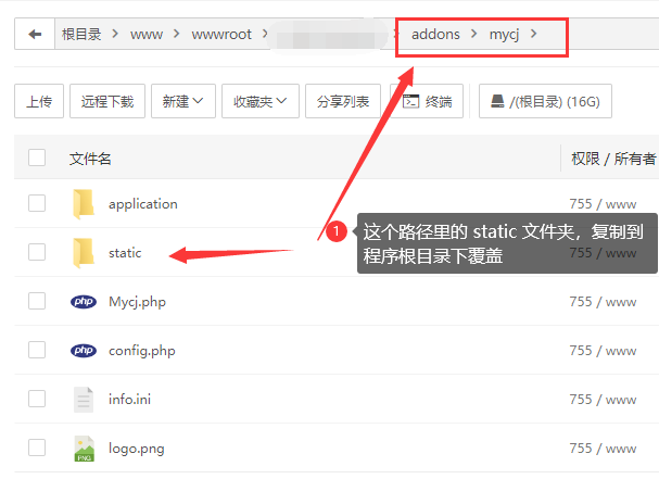 如果/static/文件夹里面没有mycj这个文件夹,那么你去手动复制一下文件过来,在 /addons/mycj/文件夹里面,