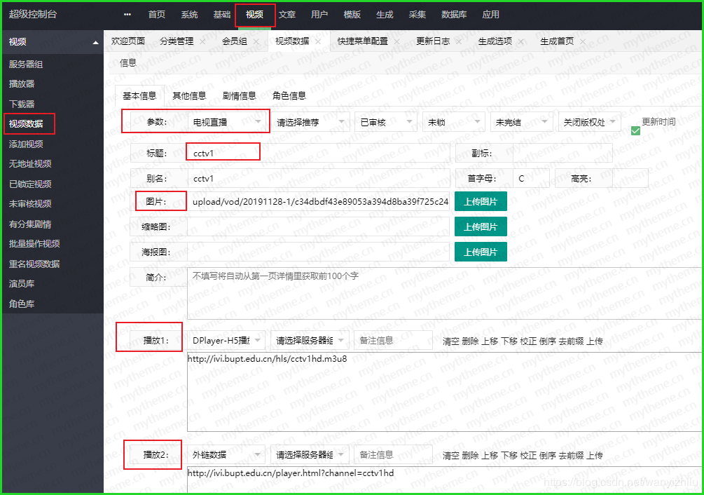 3,添加TV电视直播源链接步骤:后台视频>>视频数据>>添加>>【参数:选择我们刚添加的新分类“电视直播”】【标题:填写要添加的电视台名称】【图片:上传准备好的电视台台标】